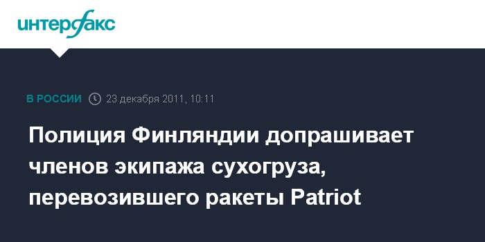 Хельсинки. 23 декабря. INTERFAX.RU - Полиция Финляндии задержала и допросила капитана, штурмана и ряд других членов украинского экипажа сухогруза Thor Liberty, задержанного в порту города Котка с грузом ракет Patriot и взрывчатых веществ на борту.