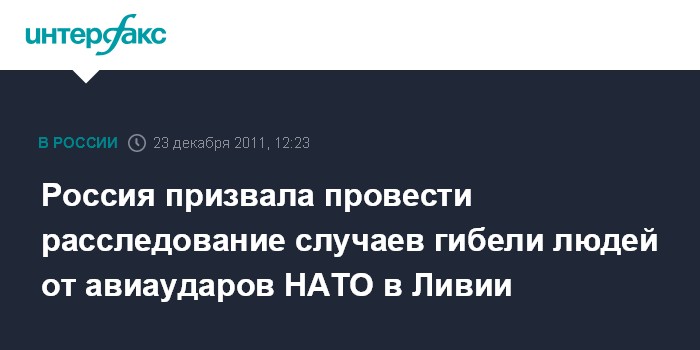 Нью-Йорк. 23 декабря. INTERFAX.RU - В ходе брифинга в Совете Безопасности ООН по Ливии Россия подняла вопрос о необходимости проведения под эгидой ООН специального расследования случаев гибели мирных жителей в результате бомбардировок НАТО.