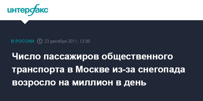 Москва. 23 декабря. INTERFAX.RU - Сильный снегопад, который начался в столице во вторник вечером, привел к тому, что количество пассажиров общественного транспорта увеличилось примерно на 1 млн ежедневно.