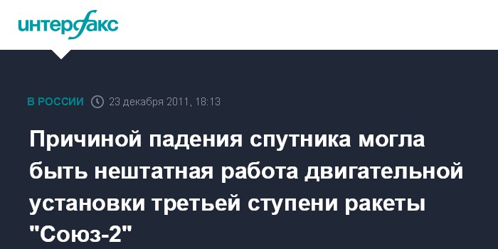 Москва. 23 декабря. INTERFAX.RU - Авария ракеты-носителя "Союз-2", стартовавшей в пятницу с Плесецка, произошла на участке работы третьей ступени ракеты, сообщил официальный представитель Минобороны РФ по Войскам воздушно-космической обороны полковник Алексей Золотухин