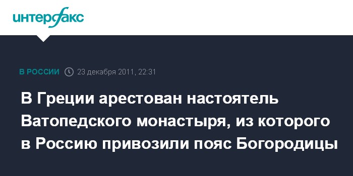 По его мнению, "этот арест носит исключительно политический характер". "Менее месяца назад пояс Пресвятой Богородицы, хранящийся в Ватопедском монастыре, привозили в Россию, и я не исключаю, что данный шаг греческих властей может быть связан именно с этим", - отметил собеседник агентства.