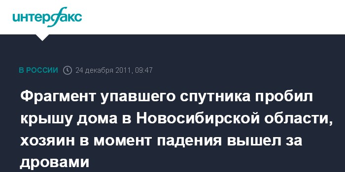 Новосибирск. 24 декабря. ИНТЕРФАКС-СИБИРЬ - Фрагмент космического аппарата "Меридиан" пробил в крыше дома в селе Вагайцево Ордынского района Новосибирской области отверстие размером метр на полтора, сообщил агентству "Интерфакс-Сибирь" один из местных жителей.