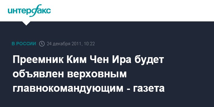 Сеул. 24 декабря. INTERFAX.RU - Преемник покойного лидера КНДР Ким Чен Ира - Ким Чен Ын - в скором времени должен быть официально объявлен верховным главнокомандующим армии, пишет в субботу ведущая северокорейская газета "Нодон синмун". "Мы возведем товарища Ким Чен Ына в ранг верховного главнокомандующего и генерала и благодаря этому добьемся успеха в революции", - отмечает это издание.