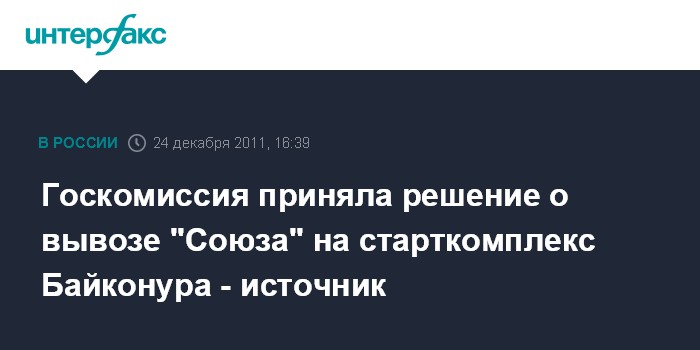Госкомиссия приняла решение о вывозе "Союза" на старткомплекс Байконура - источник