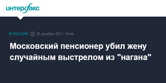 Москва. 25 декабря. INTERFAX.RU - Пожилой житель Москвы случайно убил свою жену, выстрелив по неосторожности из "нагана" во время чистки оружия, сообщил "Интерфаксу" источник в правоохранительных органах.