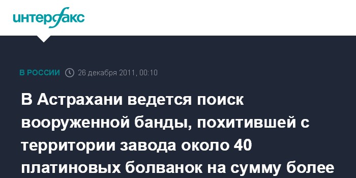 "Инцидент произошел минувшей ночью. Порядка 10-12 вооруженных человек в масках проникли на территорию одного из предприятий в городе Астрахани, нейтрализовали охранников, затем зашли в цех, где в это время работала ночная смена, повредили оборудование, после чего похитили порядка 40 платиновых болванок и, загрузив их в автомобиль, скрылись в неизвестном направлении", - сказал собеседник агентства.
