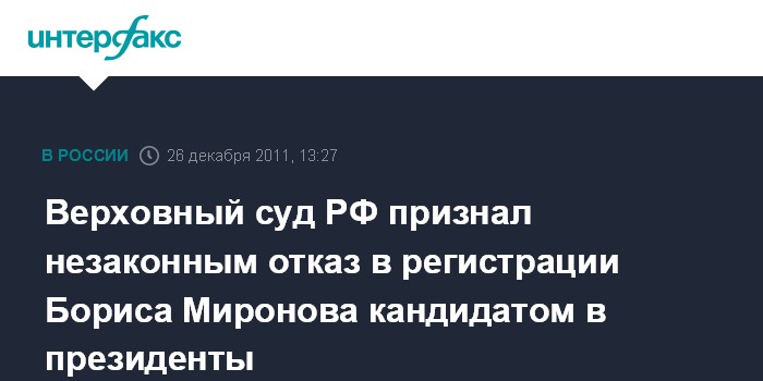 Москва. 26 декабря. INTERFAX.RU - Отказ Центральной избирательной комиссии РФ публицисту Борису Миронову в участии в президентской избирательной кампании признан незаконным. Соответствующее решение принял в понедельник Верховный суд РФ.