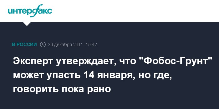 "Американский Объединенный центр космических операций опубликовал прогноз, в соответствии с которым сход аппарата с орбиты произойдет 14 января в 02:28 по Московскому времени, - сказал И.Лисов. - Однако сами же американцы дали допуск в плюс-минус одиннадцать суток, то есть в действительности они считают, что с высокой долей вероятности "Фобос-Грунт" может упасть в промежутке между 2 и 25 января".