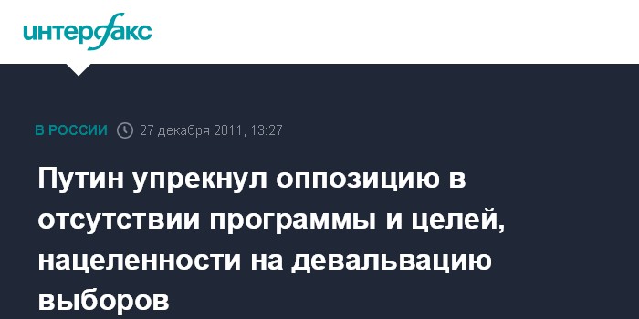 Москва. 27 декабря. INTERFAX.RU - Премьер-министр РФ Владимир Путин заявил, что у сил, которые пытаются поставить под сомнение, в том числе, итоги выборов, нет единой программы и ясных целей.