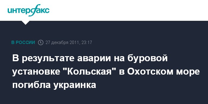 Киев. 27 декабря. INTERFAX.RU - В результате аварии на буровой платформе "Кольская" в Охотском море погибла гражданка Украины, сообщает МИД Украины во вторник.