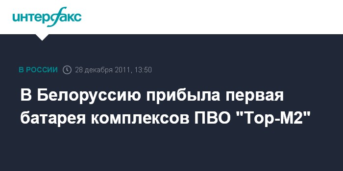 Минск. 28 декабря. INTERFAX.RU - Первая батарея зенитного ракетного комплекса "Тор-М2" поступила из России в ВВС и войска ПВО Вооруженных сил Белоруссии.