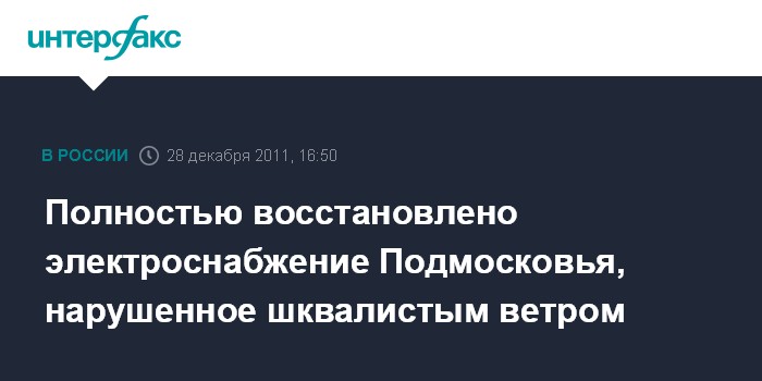 Москва. 28 декабря. INTERFAX.RU - Сотрудники ОАО "Московская объединенная электросетевая компания" (МОЭСК) включили все трансформаторные подстанции, обесточенные в результате шквалистого ветра в Московской области.