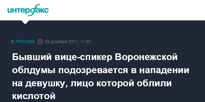 Воронеж. 29 декабря. INTERFAX.RU - В Воронеже арестован мужчина, подозреваемый в том, что плеснул в лицо девушки серную кислоту, сообщил "Интерфаксу" в четверг следователь по особо важным делам следственного управления СКР по Воронежской области Сергей Платонов.