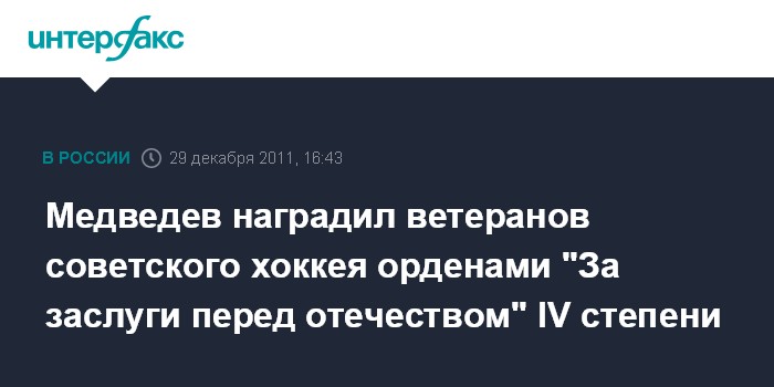 Москва. 29 декабря. INTERFAX.RU - Президент России Дмитрий Медведев подписал указ "О награждении государственными наградами Российской Федерации" ветеранов советского хоккея.