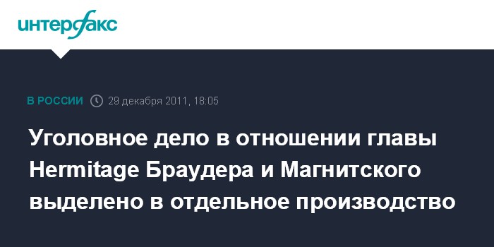 Москва. 29 декабря. INTERFAX.RU - Уголовное дело по обвинению главы фонда Herminage Уильяма Браудера и скончавшегося в московском СИЗО Сергея Магнитского выделено в отдельное производство.