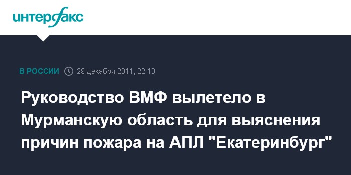 Москва. 29 декабря. INTERFAX.RU - Комиссия из представителей главного штаба Военно-морского флота вылетела в Мурманскую область для выяснения причин пожара на атомной подводной лодке "Екатеринбург", сообщил "Интерфаксу-АВН" в четверг официальный представитель Минобороны РФ полковник Игорь Конашенков.