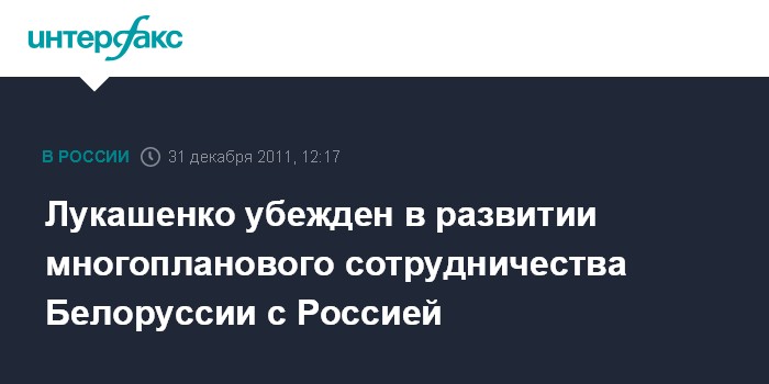 Минск. 31 декабря. INTERFAX.RU - Президент Белоруссии Александр Лукашенко поздравил руководство России с Новым годом, выразив уверенность в продолжении конструктивного сотрудничества между странами. "Убежден, что наше конструктивное многоплановое партнерство будет и в дальнейшем способствовать реализации потенциала стратегического взаимодействия между Белоруссией и Россией, служить дополнительным импульсом к интеграции двух государств", - говорится в поздравительном послании А.Лукашенко президенту Российской Федерации Дмитрию Медведеву.