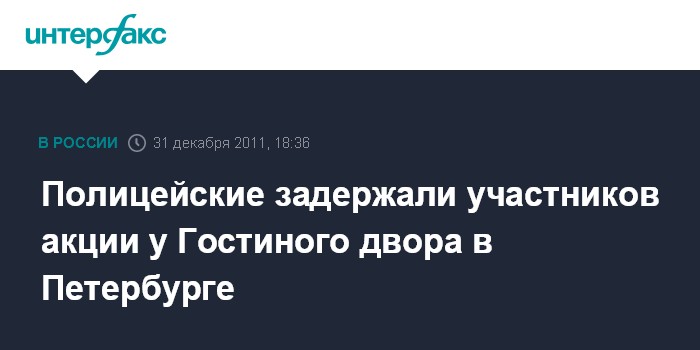 Санкт-Петербург. 31 декабря. INTERFAX.RU - Сотрудники полиции в субботу вечером задержали несколько участников несанкционированного митинга, устроенного оппозиционерами у Гостиного двора в Петербурге, сообщает корреспондент "Интерфакса".