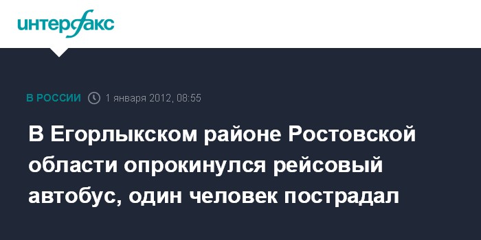 Ростов-на-Дону. 1 января. ИНТЕРФАКС-ЮГ - Автобус, выполнявший рейс Ростов - Ставрополь, опрокинулся примерно в 80-ти км от Ростова-на-Дону, сообщили агентству "Интерфакс - Юг" в правоохранительных органах.