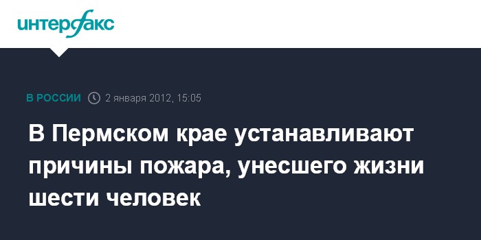 Москва. 2 января. INTERFAX.RU - Следственный комитет РФ проводит доследственную проверку по факту пожара в Пермском крае, при котором погибли шесть человек, в том числе двое детей. "Сегодня около 6 часов утра в городе Березники Пермского края в ходе тушения пожара в одной из квартир многоквартирного дома обнаружены тела трех женщин, мужчины и двух малолетних детей: мальчика в возрасте 1 года 3 месяцев и 4-летней девочки", - сказано в сообщении СК РФ, размещенном на его официальном сайте в понедельник.