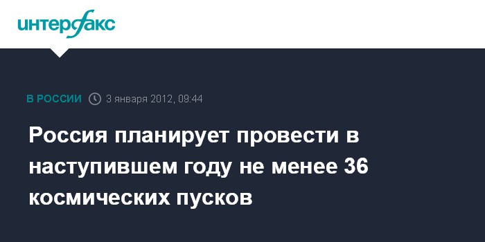 Москва. 3 января. ИНТЕРФАКС-АВН - В 2012 году Россия намерена осуществить 36 пусков ракет-носителей с космодромов Байконур и Плесецк, не учитывая пусков по программе "Морской старт" и в рамках российско-европейского проекта "Союз" в Куру", сообщил "Интерфаксу-АВН" источник в ракетно-космической отрасли.