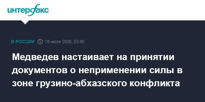 Москва. 19 июля. ИНТЕРФАКС - Чем быстрее будет реализовано соглашение о неприменении силы в зоне грузино-абхазского конфликта, тем больше будет шансов для решения других аспектов урегулирования, заявил президент России Дмитрий Медведев.