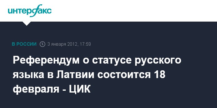 Рига. 3 января. INTERFAX.RU/BNS - Референдум о внесении в Конституцию Латвии поправок, присваивающих русскому языку статус второго государственного, состоится в субботу, 18 февраля, сообщили BNS в Центризбиркоме (ЦИК). ЦИК выбрал самую позднюю возможную дату, чтобы можно было обеспечить проведение референдума также за границей, уточняют в ведомстве.