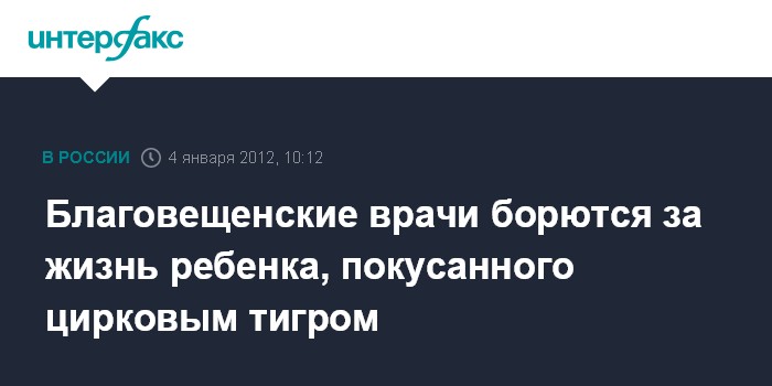 Благовещенск. 4 января. INTERFAX.RU - В Благовещенске в гастролирующем цирке "Лигер" Амурский тигр укусил трехлетнего мальчика, ребенок находится в тяжелом состоянии, сообщили агентству "Интерфакс - Дальний Восток" в среду в пресс-службе ГУ МЧС России по Амурской области. "Ребенок доставлен в нейрохирургическое отделение клинической больницы города Благовещенска", - отметили в пресс-службе.