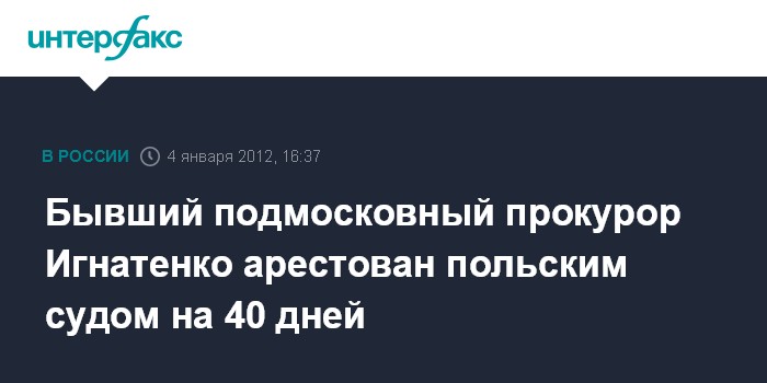 Москва. 4 января. INTERFAX.RU - Польский суд города Новый Сонч принял решение арестовать бывшего российского прокурора Александра Игнатенко на 40 дней, сообщает британская телерадиовещательная корпорация Би-би-си в среду. Окончательное решение на этот счет в ближайшее время примет министр юстиции Польши. В течение сорока дней российские власти должны отправить запрос об экстрадиции А.Игнатенко.