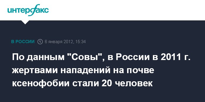 По данным "Совы", в России в 2011 г. жертвами нападений на почве ксенофобии стали 20 человек