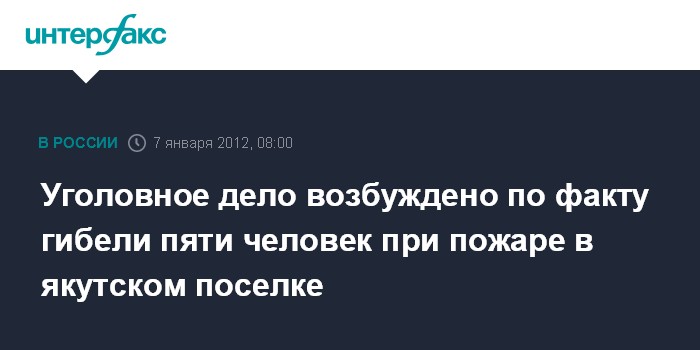 Якутск. 7 января. ИНТЕРФАКС - ДАЛЬНИЙ ВОСТОК - Следствие возбудило уголовное дело по факту пожара в жилом доме села Амга в Якутии, в результате которого погибли пять человек, сообщает пресс-служба СУ СКР по республике Саха (Якутия).