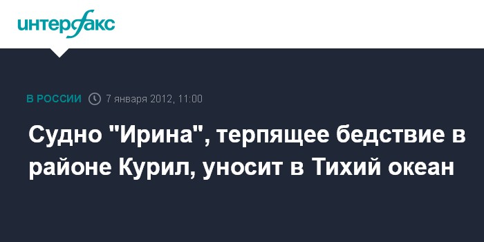 "Дрейфующую "Ирину", на которой уже нет экипажа, понемногу уносит в Тихий океан. Но рядом с рефрижератором находятся суда "Суворовец" и "Атлас". Правда, взять на буксир аварийную "Ирину" из-за сильного шторма пока не удается", - сообщил агентству "Интерфакс - Дальний Восток" в субботу представитель сахалинского бассейнового аварийно-спасательного управления (СахБасу).