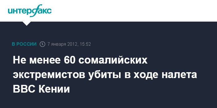 Найроби. 7 января. INTERFAX.RU - По меньшей мере, 60 боевиков террористической группировки "Аш-Шабаб" погибли на юге Сомали в результате авиаудара, нанесенного кенийскими военными, сообщил в субботу официальный представитель вооруженных сил Кении Сайрус Огуна.