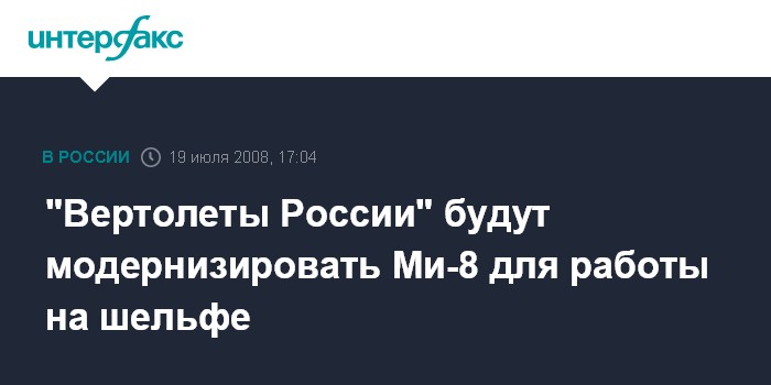 Москва. 19 июля. INTERFAX.RU - Компания "Вертолеты России" разрабатывает проект глубокой модернизации вертолета Ми-8 для использования его на северных нефтегазовых месторождениях и шельфе, сообщил журналистам генеральный директор компании "Вертолеты России" Андрей Шибитов.