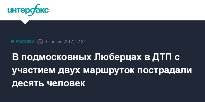 Москва. 9 января. ИНТЕРФАКС - Десять человек пострадали в результате столкновения двух маршрутных такси в подмосковных Люберцах, сообщил "Интерфаксу" источник в правоохранительных органах.