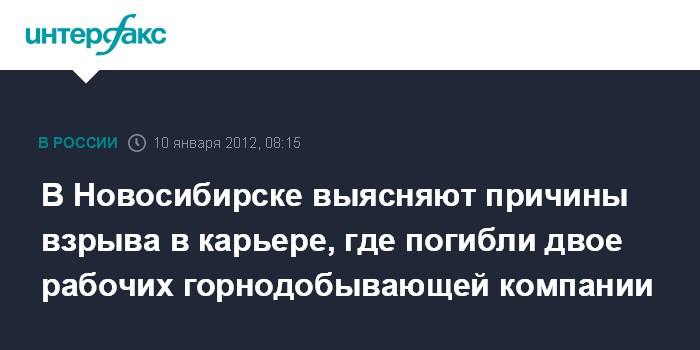 Новосибирск. 10 января. ИНТЕРФАКС-СИБИРЬ - Следственные органы Новосибирской области проводят доследственную проверку по факту взрыва газового баллона в карьере Борок, из-за чего накануне погибли двое и один рабочий пострадал.