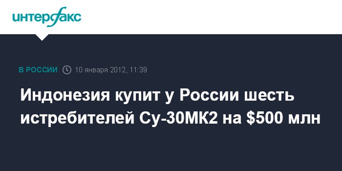 Москва. 10 января. INTERFAX.RU - Индонезия закупила у России еще шесть многофункциональных истребителей Су-30МК2, сообщил "Интерфаксу-АВН" во вторник источник в оборонно-промышленном комплексе.