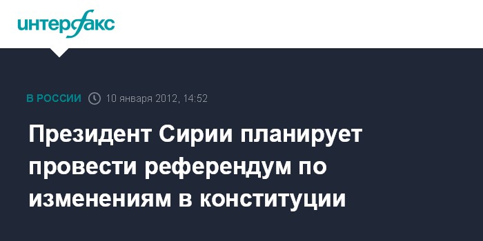 Дамаск. 10 января. INTERFAX.RU - Президент Сирии Башар Асад в ходе телеобращения к народу во вторник заявил, что планирует проведение референдума по принятию поправок в конституцию страны в марте 2012 года.