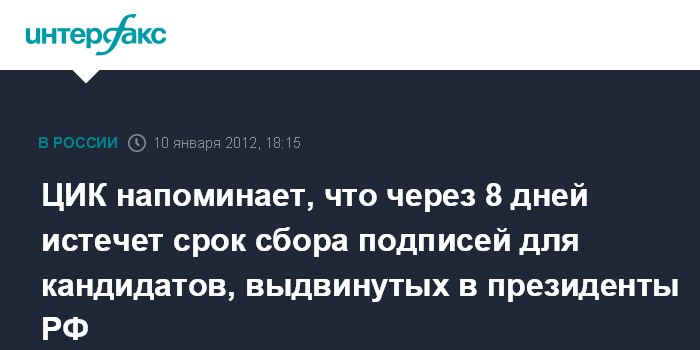 Москва. 10 января. INTERFAX.RU - ЦИК РФ напоминает, что 18 января истекает срок подачи документов для регистрации кандидатов на должность президента России.