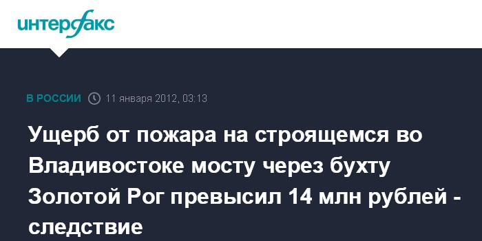 Владивосток. 11 января. ИНТЕРФАКС-ДАЛЬНИЙ ВОСТОК - Следственные органы Приморья обнародовали данные ущерба от пожара на мосту через бухту Золотой Рог, который строится во Владивостоке в рамках подготовки города к саммиту АТЭС-2012.