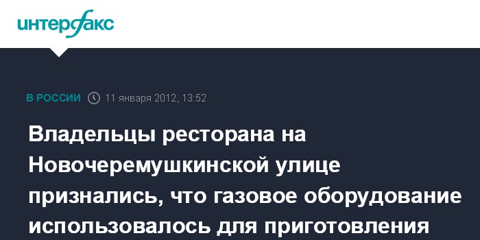 Москва. 11 января. INTERFAX.RU - Владельцы сгоревшего ресторана в московском районе Новые Черемушки признали факт использования газового оборудования для приготовления пищи, сообщил "Интерфаксу" официальный представитель СК РФ Владимир Маркин.