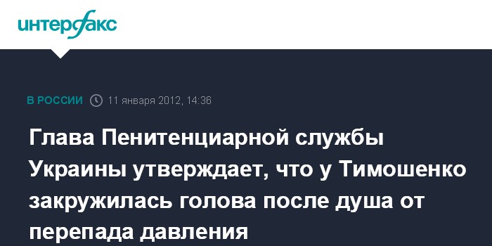 Киев. 11 января. INTERFAX.RU - Глава Государственной пенитенциарной службы Украины Александр Лисицков утверждает, что экс-премьер Юлия Тимошенко не теряла сознание 6 января после приема лекарств. "Насколько я знаю, она не теряла сознание… голова закружилась при падении давления… да, я думаю, многие, каждый из нас, особенно кто был в бане, в парилке, и выходил - и голова закружилась. Это все может быть", - заявил А.Лисицков журналистам в среду.