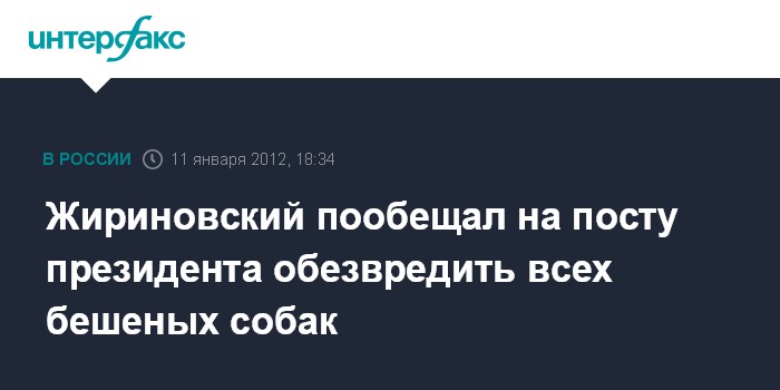"Как кандидат в президенты России, я обещаю - в случае победы на выборах 4 марта один из первых моих указов будет касаться именно ужесточения ответственности за отсутствие контроля над бродячими собаками. Все бешеные животные будут обезврежены", - цитирует в среду Жириновского пресс-служба партии.