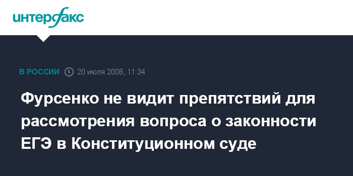 Москва. 20 июля. INTERFAX.RU - Министр образования и науки РФ Андрей Фурсенко не возражает против рассмотрения в Конституционном суде вопроса о законности введения Единого госэкзамена (ЕГЭ) в России.