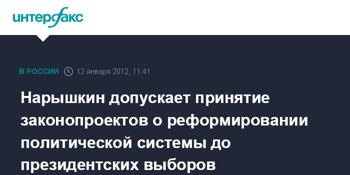 Москва. 12 января. ИНТЕРФАКС - Председатель Госдумы Сергей Нарышкин не исключил, что президентские законопроекты, направленные на либерализацию политической системы, могут быть приняты до выборов главы государства, которые пройдут 4 марта.