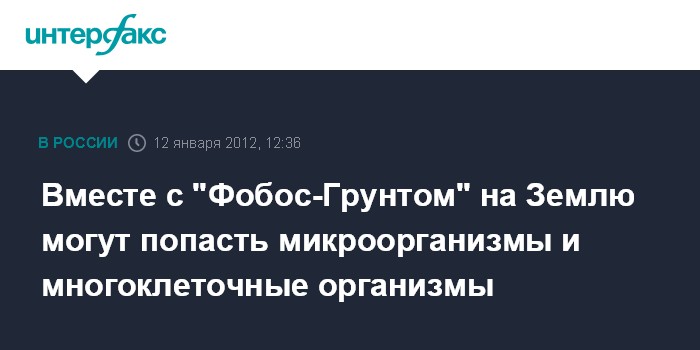 Москва. 12 января. INTERFAX.RU - Биообъекты, находящиеся на борту падающей российской межпланетной станции "Фобос-Грунт", не представляют угрозы для биосферы Земли, сообщил "Интерфаксу-АВН" заместитель заведующего лабораторией Института медико-биологических проблем (ИМБП) Владимир Сычев.