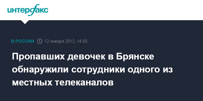 Брянск. 12 января. INTERFAX.RU - Школьниц, пропавших в Брянске в среду, обнаружили сотрудники одного из местных телеканалов, когда делали в Отрадном экспресс-опрос горожан по поводу исчезновения детей, сообщил "Интерфаксу" пресс-секретарь губернатора Брянской области Дмитрий Огнев.