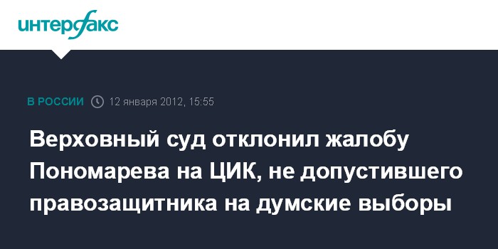 Москва. 12 января. INTERFAX.RU - Верховный суд РФ окончательно отказался рассматривать жалобу правозащитника Льва Пономарева на решение ЦИК не регистрировать его в качестве самовыдвиженца на выборах в Госдуму.