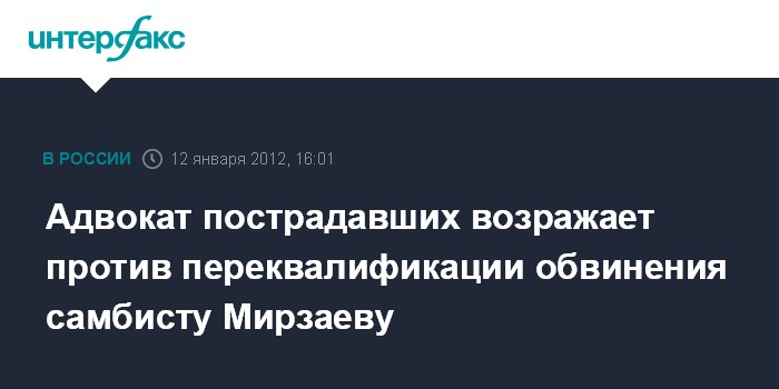 Москва. 12 января. INTERFAX.RU - Защита семьи москвича Ивана Агафонова, который погиб от удара чемпиона мира по боевому самбо Расула Мирзаева, не согласится с переквалификацией обвинения спортсмену на более мягкую статью.