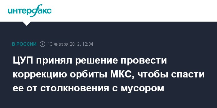 Москва. 13 января. INTERFAX.RU - Центр управления полетами (ЦУП, Королев, Московская область) в 20:10 по московскому времени проведет маневр по уклонению Международной космической станции (МКС) от фрагмента американского спутника Iridium-33, говорится в сообщении, опубликованном на сайте ЦУПа.